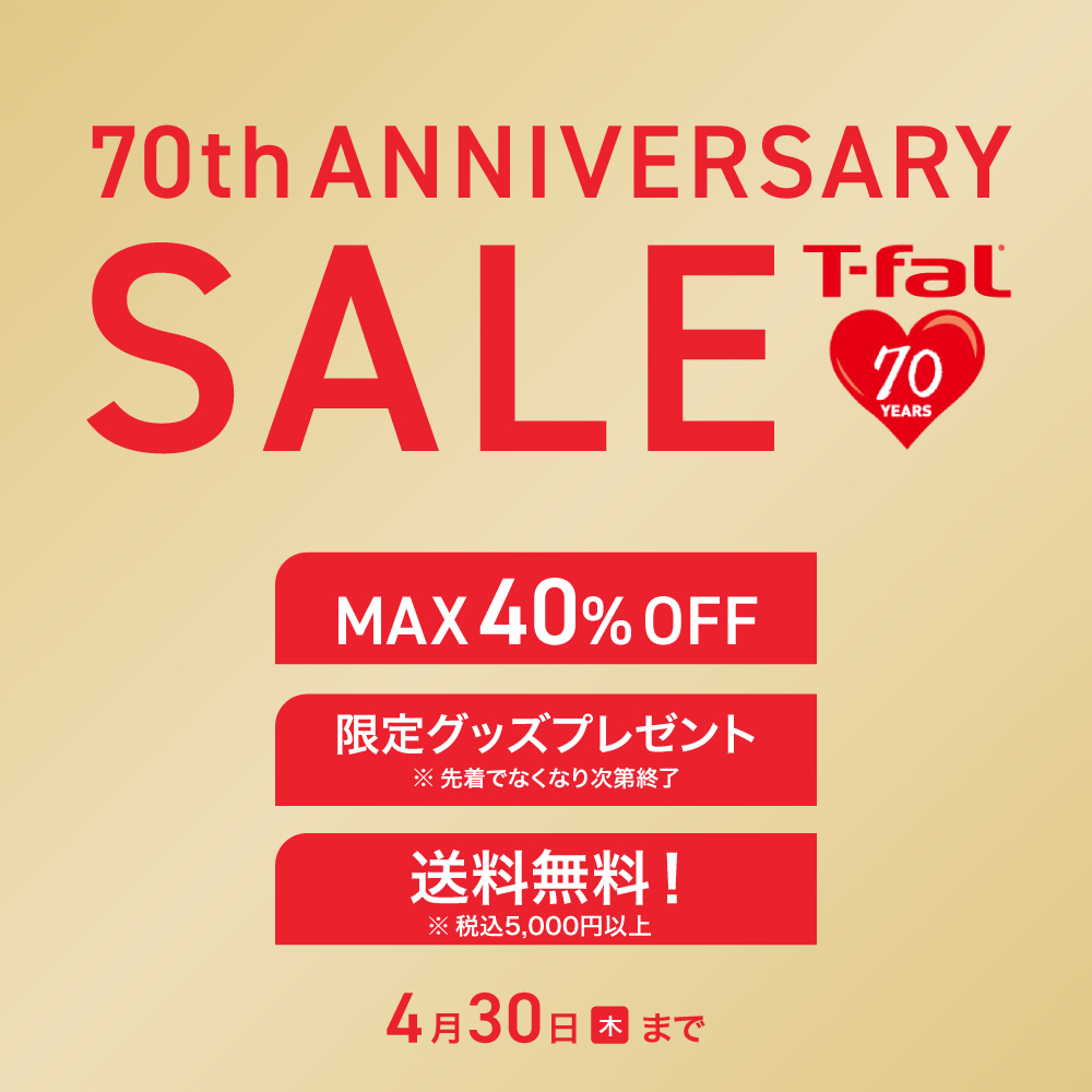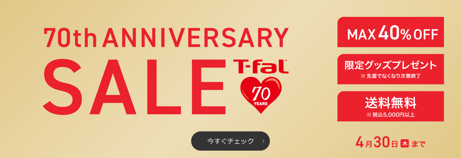 ティファール70周年記念セールティファールはおかげさまで誕生から70年。ティファール製品をご愛用いただいている多くの皆さまへの感謝を込めて、お得なセール開催中♪ さらに、送料無料やオリジナルグッズプレゼントも!