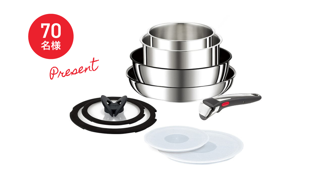 ティファールとのエピソードを投稿くださった方の中から抽選で70名様に取っ手のとれるフライパン・鍋9点セットをプレゼント!
