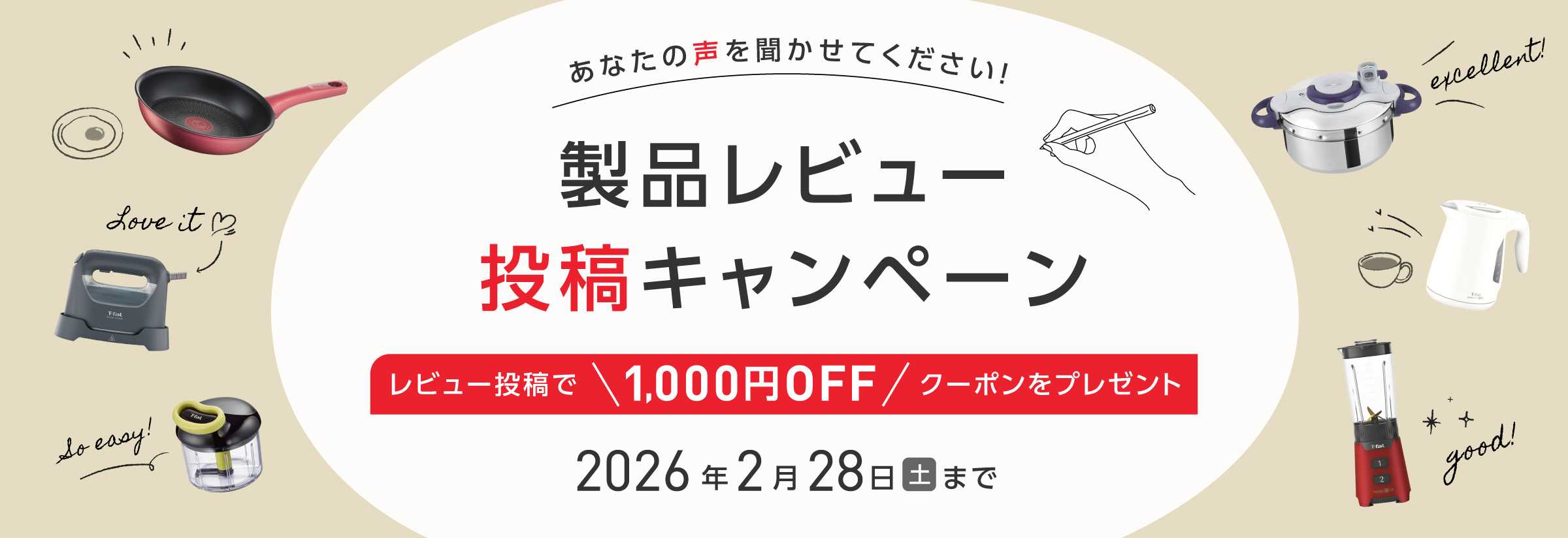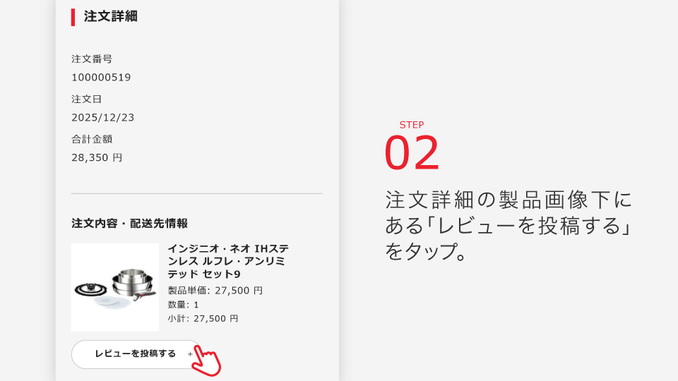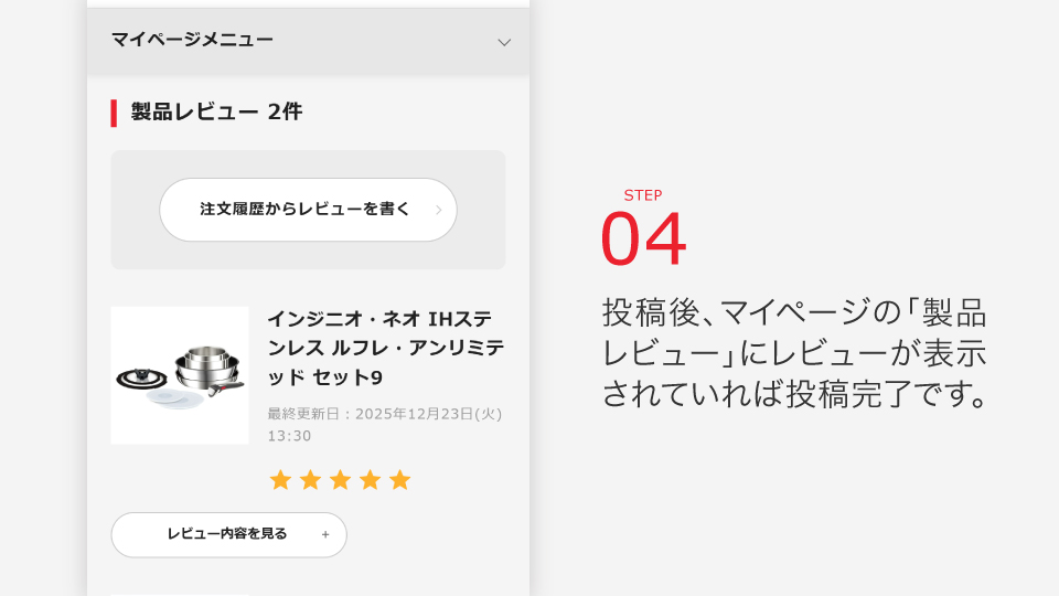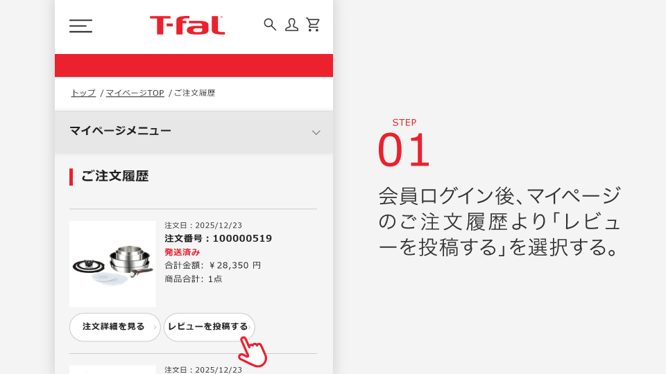 期間中、マイページの「ご注文履歴」にある製品に対してレビュー投稿していただくと、次回以降のお買い物でご利用いただける1,000円OFFクーポンをプレゼントいたします。