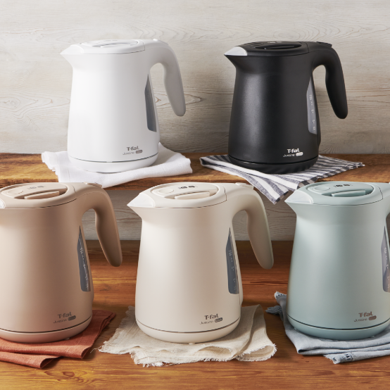 ティファールの温度調節ケトルは、キッチンやリビングなど、インテリアに馴染むデザインで生活空間を彩る。
