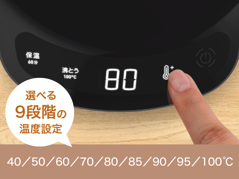 | 特長 | 軽くて使いやすい9段階の温度コントロールケトル | 使いやすい大容量温度調節ケトル | 中が見えて使いやすい9段階の温度コントロールケトル |