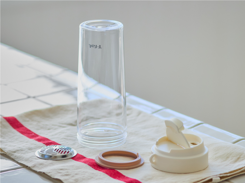 丸洗いOK。さらに、本体、ふた、パッキン、フィルターに分解でき、隅々まできれいに洗える。