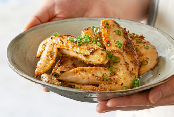 エクスペリエンス+若鶏胸肉と生ハムのソテー ズッキーニ添えハーブ風味レモンとバターのソース淡白な鶏むね肉に生ハムで旨味を、プロバンスのハーブミックスで香りを加えた、白ワインに合う一品。熱伝導に優れたフライパンなので、鶏むね肉に均一に熱が入り、生ハムの表面は美しい焼き色に。