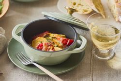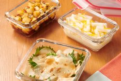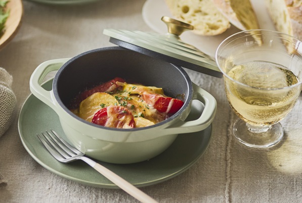 エアココットミニにミートソースと彩り野菜を入れて焼くだけ。手軽に作れて、食卓が華やぐミニグラタンが楽しめます♪
