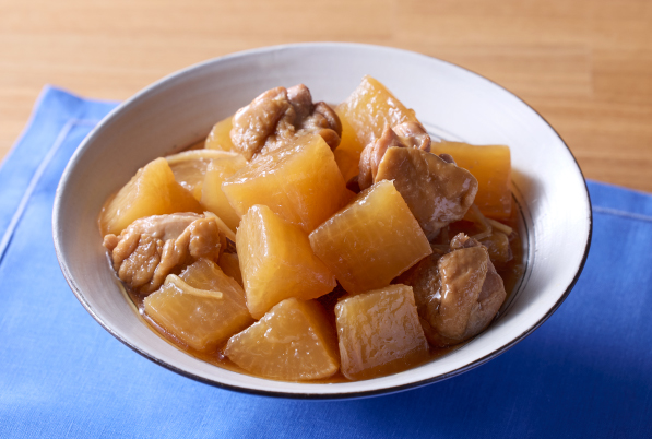 やわらかく煮込んだ大根に、鶏肉のうまみがよくしみています。ほろほろの鶏肉の食感をたのしんで。