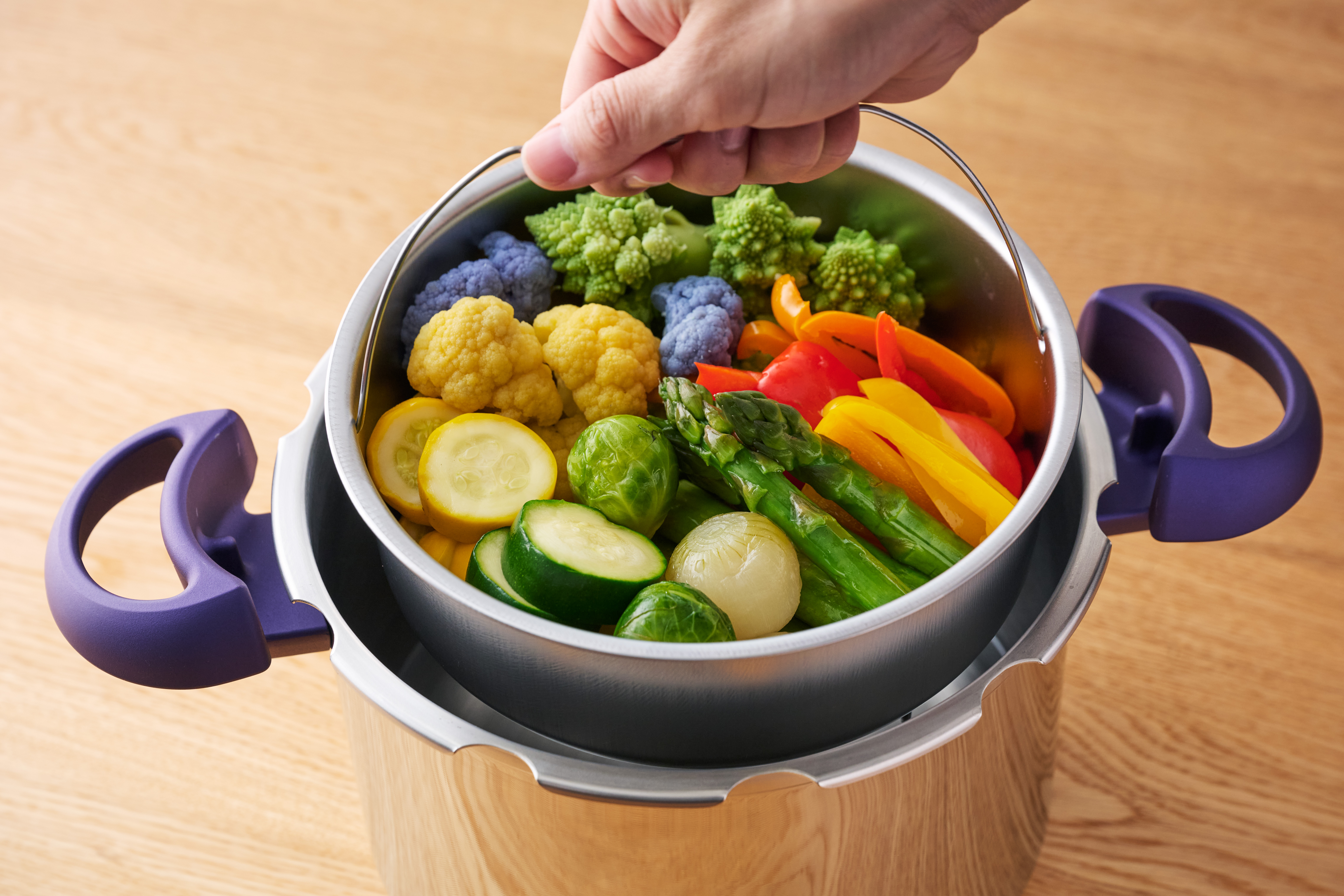 密閉して100℃以上の高温で加熱する圧力調理だから、普通の鍋と比べて調理時間を最大1/3※に短縮。さらに長時間の加熱に弱いビタミンCも、圧力調理なら最大+80%※キープ。おいしくて栄養もたっぷり。