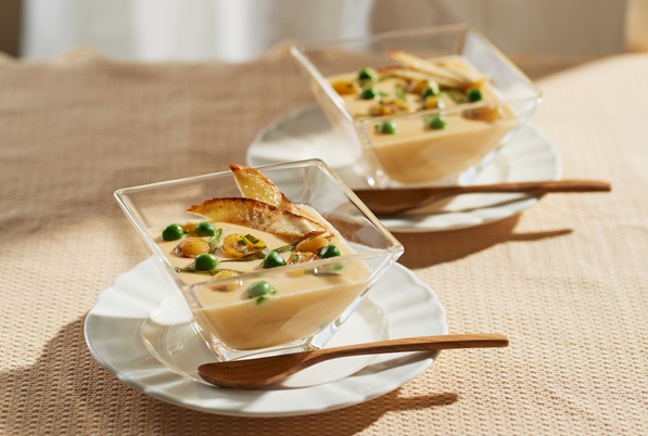 45分 フレンチ 普通 圧力鍋コーンとココナッツミルクの冷製ヴルーテ ~カレー風味のチキン添え~口あたりのなめらかな「ヴルーテ」を、ココナッツミルクとカレーパウダーでエスニック風にアレンジ。コーンのやさしい甘さとベストマッチ。