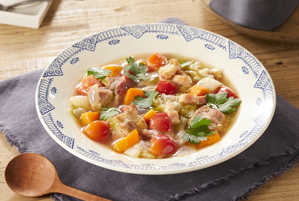エクスペリエンス+豚バラ肉、モンベリヤールソーセージと根菜類のブレゼフランスの家庭で愛される煮込み料理。豚バラ肉と根菜は焦げる寸前まで炒めると風味豊かに。モンベリヤールソーセージのスモーキーな香りが広がり、ブイヨンだけで素材の味が楽しめます。