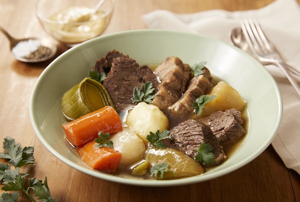 エクスペリエンス+豚バラ肉、モンベリヤールソーセージと根菜類のブレゼフランスの家庭で愛される煮込み料理。豚バラ肉と根菜は焦げる寸前まで炒めると風味豊かに。モンベリヤールソーセージのスモーキーな香りが広がり、ブイヨンだけで素材の味が楽しめます。