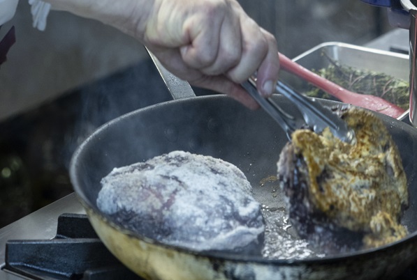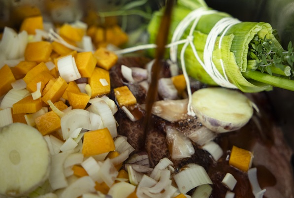 エクスペリエンス+豚バラ肉、モンベリヤールソーセージと根菜類のブレゼフランスの家庭で愛される煮込み料理。豚バラ肉と根菜は焦げる寸前まで炒めると風味豊かに。モンベリヤールソーセージのスモーキーな香りが広がり、ブイヨンだけで素材の味が楽しめます。